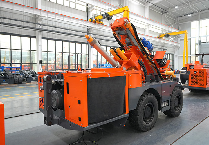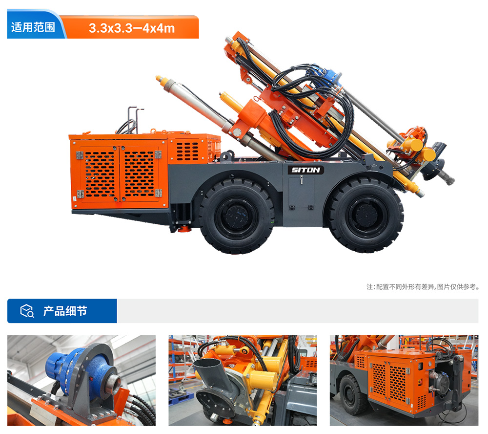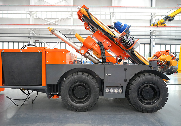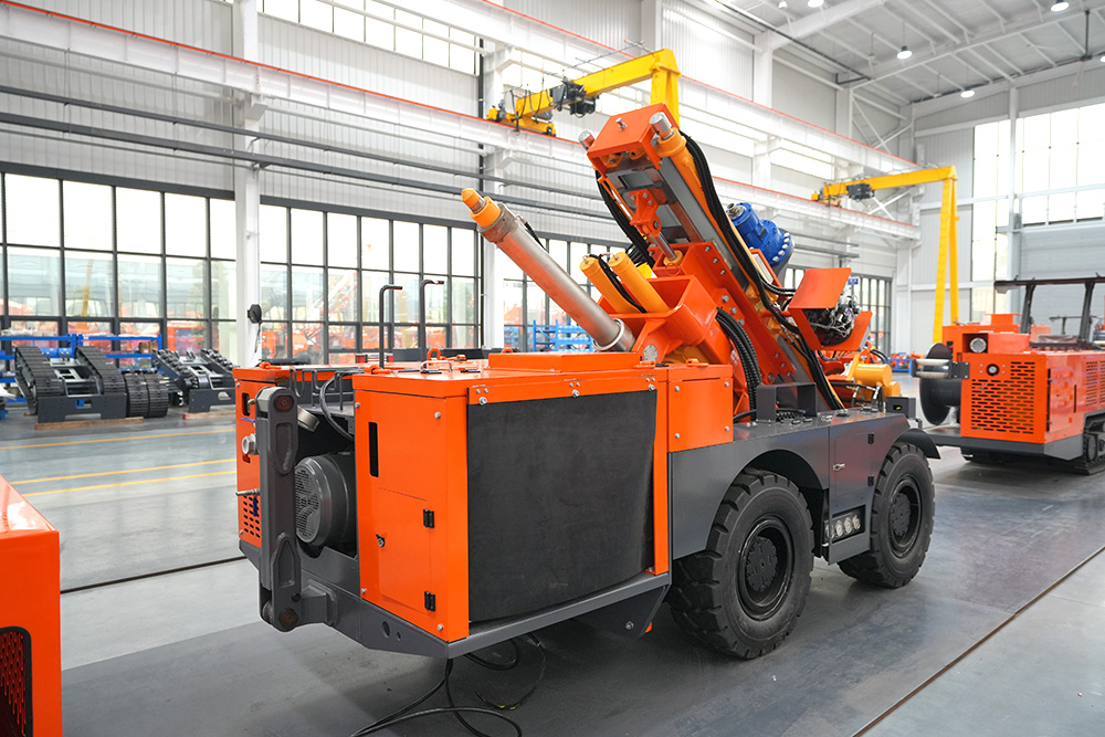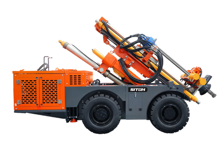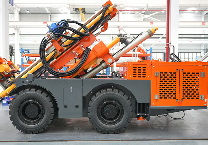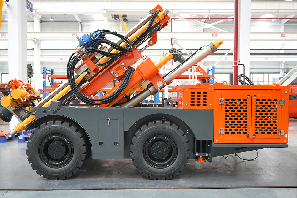 KODT-125是一款輪胎式礦用潛孔鉆機,電壓等級:380V,采用潛孔沖擊器作業(yè),閉式四驅(qū)液壓系統(tǒng),適用于3.3-4m地下采場環(huán)形孔的穿鑿,是專用的穿孔設(shè)備,也可用于天井和斜井的開鑿及回采作業(yè)。主要功能和裝置如下:適用于鉆孔直徑范圍120-254mm,鉆孔深度0-100m;鉆架可環(huán)向360°旋轉(zhuǎn),前后-10°-55°度擺動,適用于環(huán)向打孔;鉆臂裝載有液壓穩(wěn)桿機構(gòu),保證鉆孔直度,偏斜率≤1%;機身配有頂升支腿和后擺動橋,可在路面坑洼惡劣條件下工作;設(shè)備四驅(qū)驅(qū)動,可實現(xiàn)360°轉(zhuǎn)彎,原地掉頭;長距離移動時,設(shè)備可解鎖制動,且配備牽引,方便使用拖車進行快速移動;鉆機回轉(zhuǎn)具有無級調(diào)速功能,可根據(jù)不同巖層狀況調(diào)整鉆速,提高效率;且設(shè)備配置遙控裝置,方便操作人員操作設(shè)備的同時,提高了操作安全性和可靠性;設(shè)備配備了沖洗裝置,方便操作人員清理設(shè)備,維持設(shè)備整潔,提高設(shè)備使用壽命。